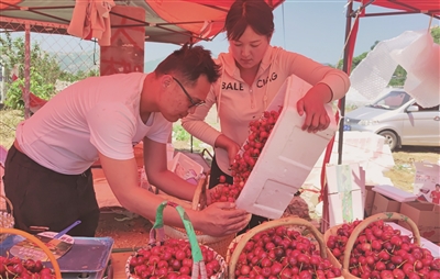 在天宝镇,前来购买樱桃的群众和客商络绎不绝。“我从湖北过来玩,听说这边樱桃比较好吃,想寄回去给身边的人尝尝。”赵先生品尝后让摊主将“黄蜜”樱桃打包,快递发往湖北。“熟得早、品质好,而且代理商非常热情,我每年都过来。”一位来自辽宁大连的客商说。