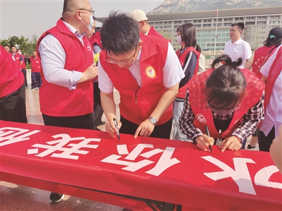 当天上午,志愿者身穿红马甲,在泰山广场开展了节水宣传。志愿者代表首先宣读了节约用水倡议书,现场人员共同在横幅上签字,并表态将节约用水理念贯穿到生活中。