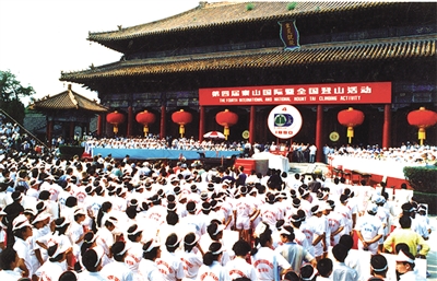 1990年9月14日拍摄的第四届泰山国际暨全国登山活动在岱庙天贶殿前开幕。
