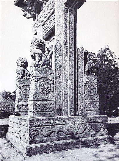 岱庙坊位于岱庙正阳门与遥参亭之间,清康熙十一年(1672年)建造。坊为四柱三间三楼式,面阔980厘米,进深300厘米,通高1130厘米,四柱置于两个长330厘米,宽315厘米,高80厘米的石座上,柱下部前后施滚墩夹杆石,石鼓面上浮雕麒麟、羊、鸟、缠枝莲花、梅花等。四柱南北抱鼓石上各有巨狮蹲列,周围都有幼狮攀耍,姿态各异,引人入胜。石坊中柱阳、阴两面均有刻联,南联是“峻极于天,赞化体元生万物;帝出乎震,赫声濯灵镇东方”,北联是“为众岳之统宗,万国具瞻,巍巍乎德何可尚;操群灵之总摄,九州待命,荡荡乎功孰于京”。中间两柱上施过梁,梁下有门楣、额枋、额板,门楣下施铁梁承托。中柱小额枋透雕双龙戏珠,龙门枋浮雕丹凤朝阳。石枋上部为歇山顶,正脊两端施高大螭吻,中立宝瓶,并有四金刚拉拽。中柱与边柱的大小额枋浮雕麒麟、仙鹤等祥瑞图,边柱外浮雕升龙。岱庙坊结体浑厚,造型凝重,是泰山十几座牌坊中体量最大、雕刻工艺最为精美的一座。