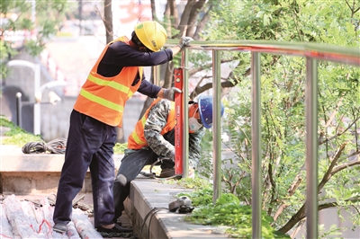 近日,市城市管理局快速落实市十八届人大四次会议代表建议,在 河西路(文化路至岱宗大街)路段安装不锈钢防护栏杆及防腐木坐凳,切实将代表“金点子”转化为民生“新福祉”。预计全长200米的防护栏杆及10组防腐木坐凳将于6月初全面完工。本报记者 隋翔 摄