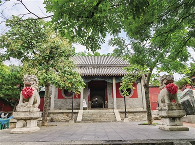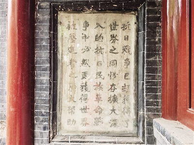 关帝庙始建于明朝初年,是泰山中路的第一组古建筑,为第六批全国重点文物保护单位。关帝庙后院元君殿前厦东西两侧墙壁上有冯玉祥将军亲手所提抗日标语,白墙墨字,镶嵌玻璃保护,东侧仅存“不、日、略、了、野心”六字,西侧为“抗日战争已经获得了世界之同情,在广大深入的抗日民族革命战争中,必然要获得世界被压迫者之广大帮助!”铮铮数言,冯玉祥抗日救国之心仿佛喷薄而出,墨字无声,读着却如雷贯耳。
