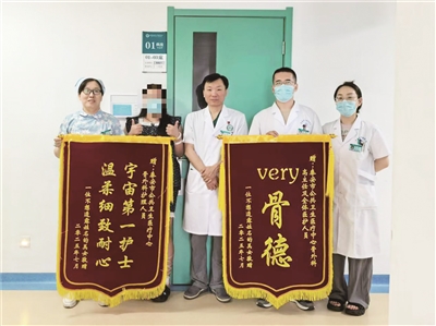 术后恢复期间,医护团持续关注小闫的康复进程。经过14个月的规范调养,小闫于今年7月再次入住骨科,顺利完成了内固定装置取出术。离院前,她特意定制两面锦旗表达心意:“作为医疗同行,我深知这份职业的责任与不易,这次经历让我更深刻体会到医患间的信任与理解的价值。”骨科护士长冯娟笑着回应:“患者的康复就是我们最好的勋章。”