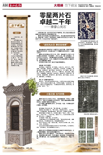 秦泰山刻石上承大篆遗风,下拓汉隶先河,其显要的书法地位,堪称我国小篆之典范,书法之瑰宝,被史学家、书法家奉为圭臬。清代藏书家、诗人王家榕盛赞其曰“零星两片石,卓越二千年。”