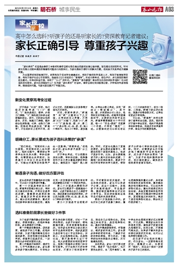 对于学生来说,可以根据自身的兴趣、学科的优势,选择最有利于自己考出最高成绩的学科组合,避免因为“偏科”陷入被动。同时,对家长也提出了更高的要求,家长要在监督学习、照顾生活两个层面的基础上,给孩子更多引导。比如,家长要梳理孩子步入高中后的各科成绩,了解每一科的单科排名,跟孩子交流对所有学科的学习感受,帮助孩子分析各个学科的优势与劣势。同时,还需要家长尽可能多地了解高校专业的选科要求,成为孩子选科决策的“参谋”,为孩子的选科提供科学的、有价值的建议,避免因为信息差导致盲目选科。