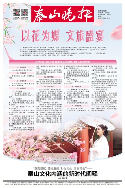本报讯(记者 刘小东)春风送暖,万物复苏。近日,记者从泰山景区了解到,为活化泰山春日生态资源,深化文旅融合,落实文旅惠民乐民、共享美好生活主题,满足广大游客与学生春假出游需求,泰山景区于4月11日至4月30日,在泰山桃花峪举办“泰麓春来时·花约彩石溪”2026泰山桃花峪春季赏花活动。